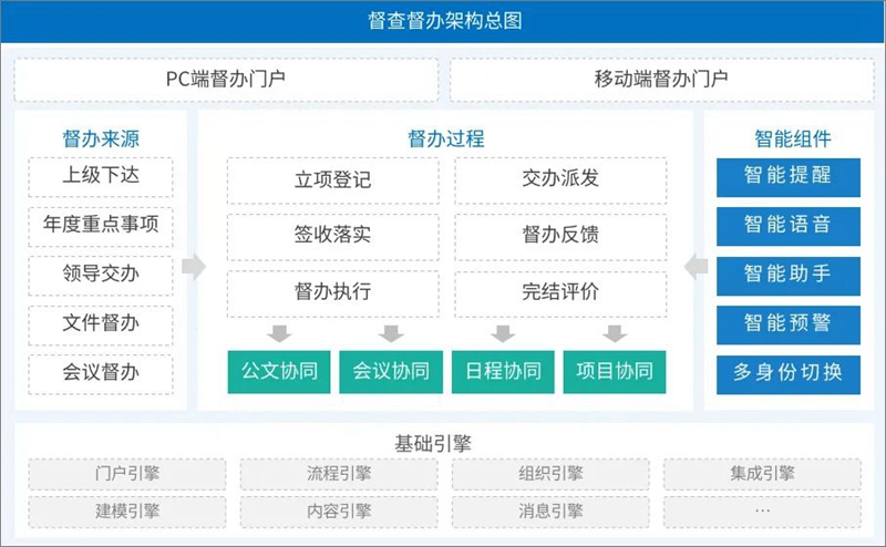 从督办事项的产生、到事项的执行跟踪、再到事项的关闭,整个业务链都可以与公文、会议等应用灵活高效协同,实现数据,应用的一体化打通,统筹协调,整合资源,提升效率。